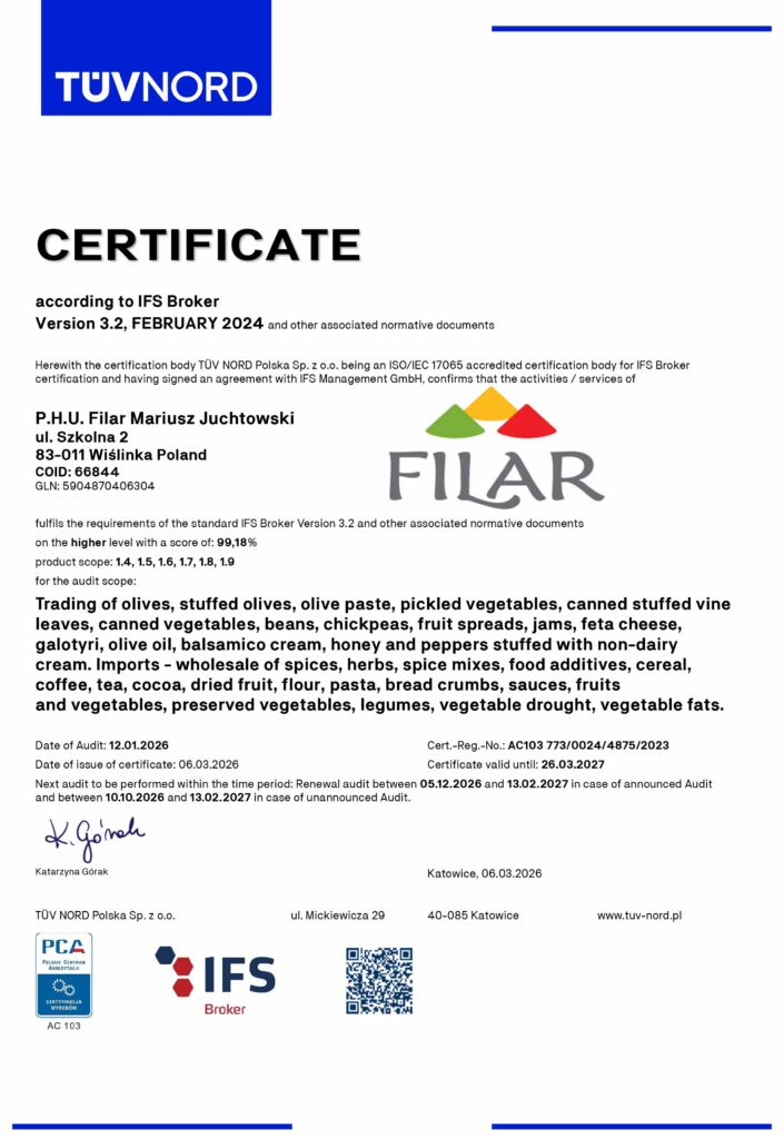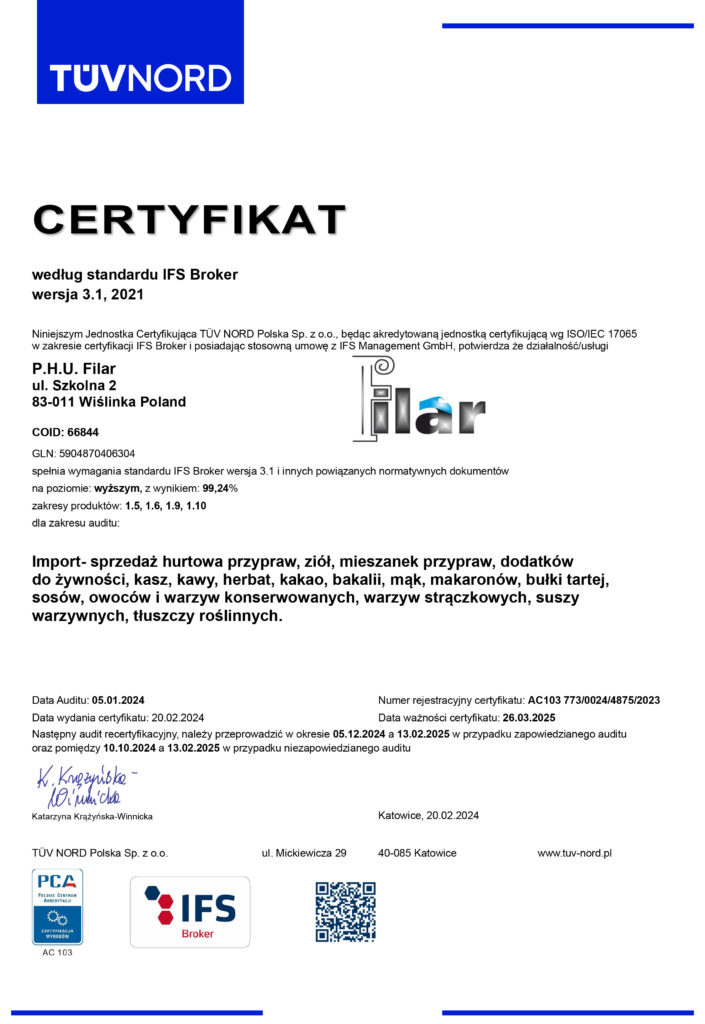 Od początku firma kładła nacisk na dążenie do pełnego zaspokojenia potrzeb klienta – co do dzisiaj owocuje wypracowaną i pewną pozycją na rynku. Filozofia ta praktycznie nieustannie wpływa na różnorodność oferowanego towaru. Swoją działalność rozpoczęliśmy na terenie Pomorza. Obecnie obsługujemy klientów z całego kraju, pozyskując kolejnych zadowolonych partnerów handlowych, poszerzając w ten sposób obszar wpływów naszej firmy. Kręgosłupem działalności firmy jest import oraz handel hurtowy przyprawami. Produkujemy własne mieszanki przypraw, a także według potrzeb i na zlecenie klienta. Wychodząc na przeciw wymaganiom jakie niesie za sobą członkostwo w Unii Europejskiej wdrożyliśmy i certyfikowaliśmy system GHP oraz HACCP (CERTYFIKAT NR 2006/HG/014). Następnie spełniając Międzynarodowy Standard Żywności (IFS Food) wdrożyliśmy i certyfikowaliśmy system IFS.